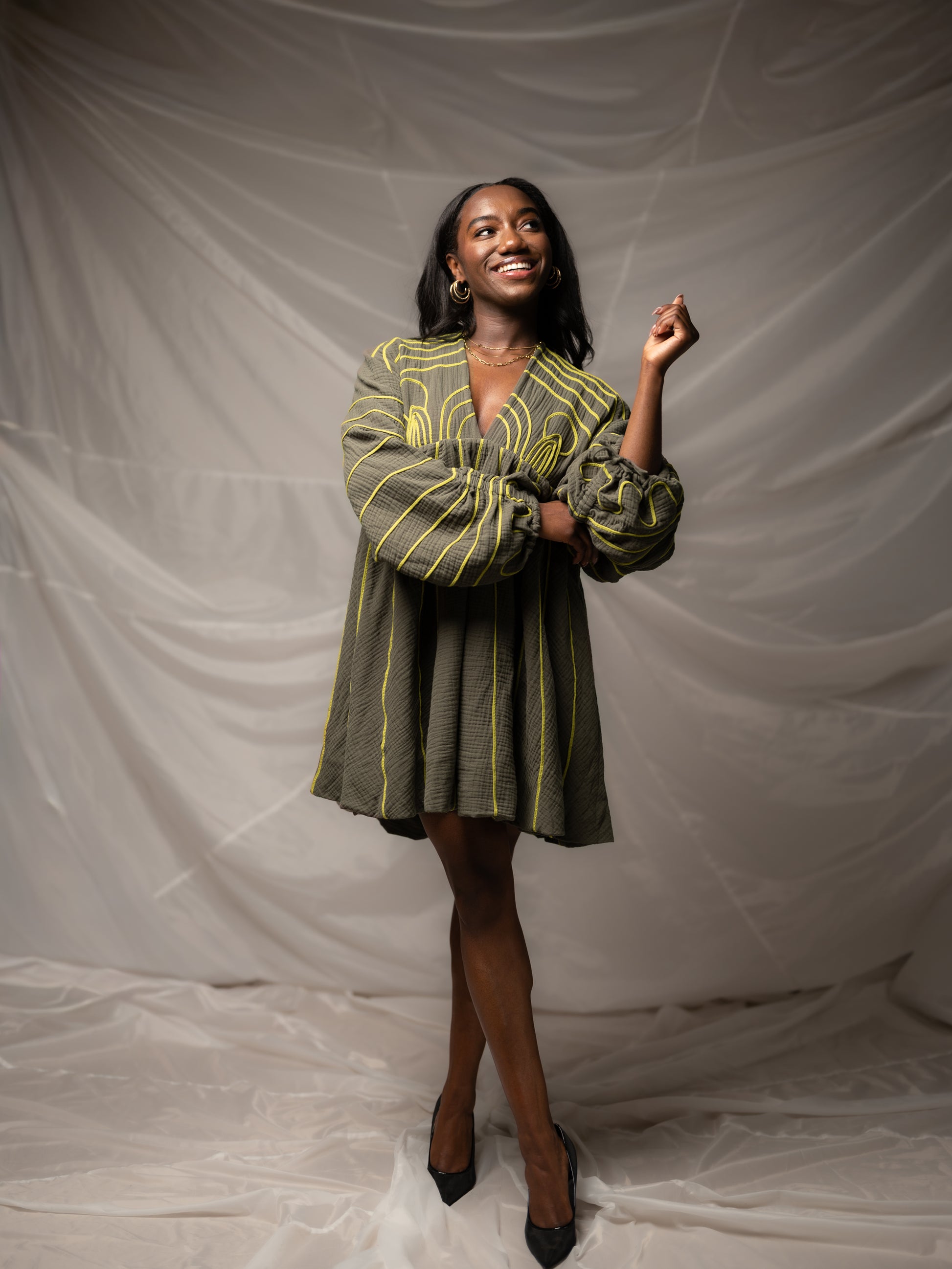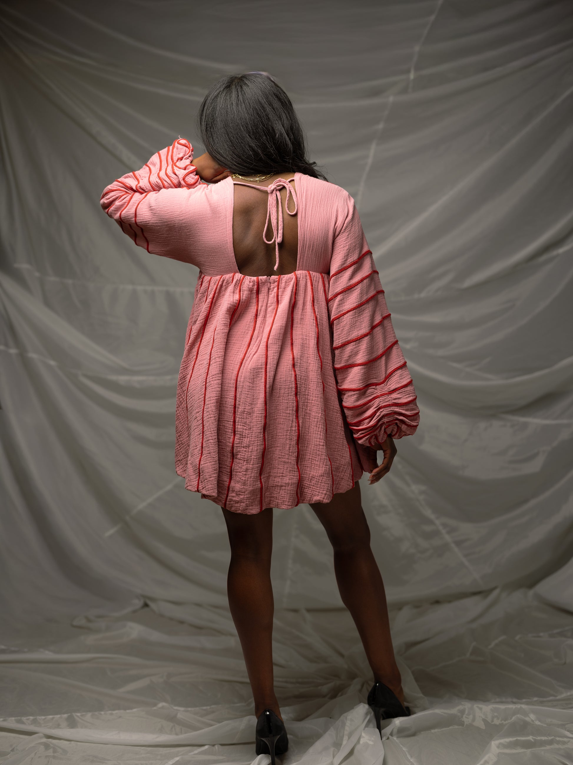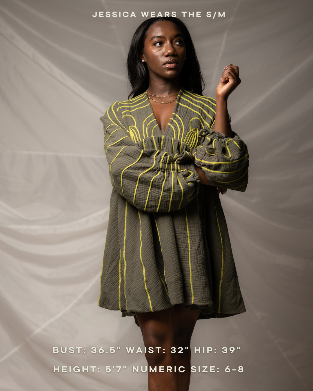 The Parachute Dress is a sweet babydoll style that doubles as a top. Its double-layered bagged hem gives this free-flowing design an added bit of soft structure and visual weight, making this a statement piece worthy of any occasion. The long ruched sleeves anchor the design with interest, while their drawstring cuffs ensure you remain functional all day long. Perhaps its most striking feature is the art-deco-inspired couching embroidery, which spans the entire garment, guaranteeing a lasting impression wherever you wear it. Made from cotton gauze, it is incredibly soft and cozy with an organic texture, thanks to its natural fibers.