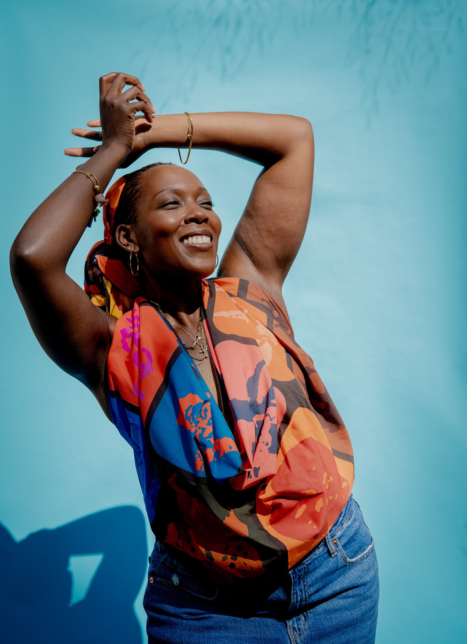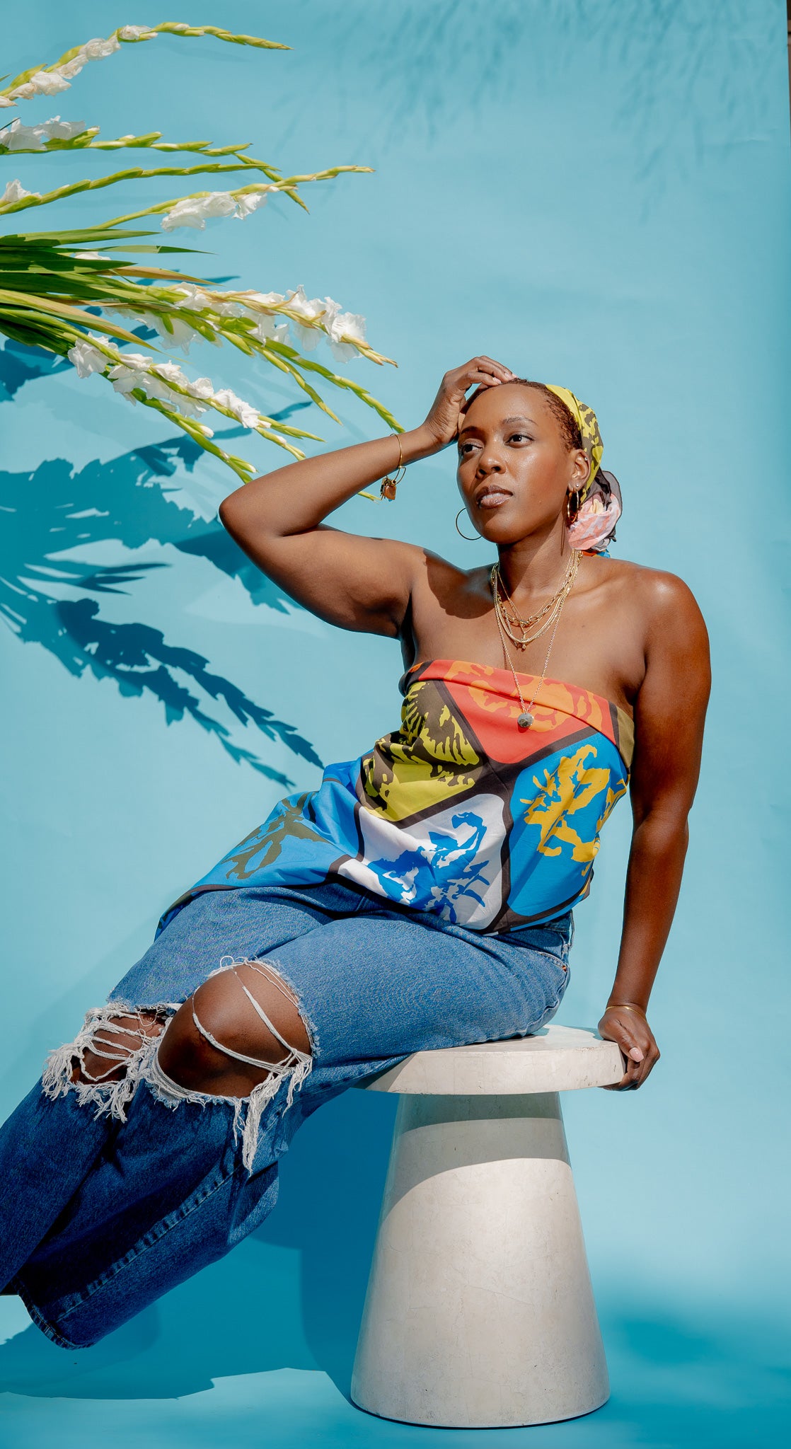 This 50 in. x 50 in. multipurpose bandana can be tied into a number of tops, skirts, bags, hair, and home accessories. It's versatile and adjustable, allowing it to accommodate a range of sizes. Fit to match any outfit, this closet staple features a vibrant print of abstract floral motifs, encapsulated in dark rounded frames.